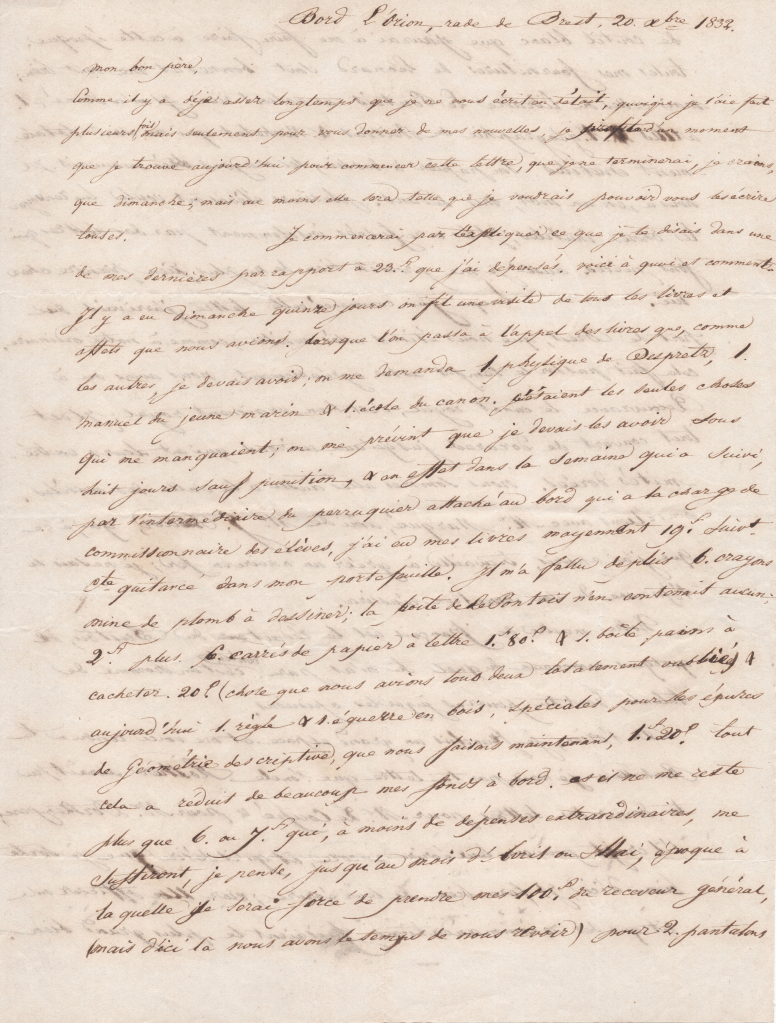 Je commencerai par t’expliquer ce que je te disais dans une de mes dernières par rapport à 23 F que j’ai dépensés. Voici à quoi et comment : Il y a eu dimanche quinze jours on fit une visite de tous les livres et effets que nous avions. Lorsque l’on passa à l’appel des livres que, comme les autres, je devais avoir ; on me demanda 1 physique de Despretz, 1 manuel du jeune marin & 1 école du canon. C’étaient les seules choses qui me manquaient ; on me prévint que je devais les avoir sous huit jours sauf punition, & en effet dans la semaine qui a suivi, par l’intermédiaire du perruquier attaché au bord qui a la charge de commissionnaire des élèves, j’ai eu mes livres moyennant 19 F Suiv! C’ quittance dans mon portefeuille. Il m’a fallu de plus 6 crayons mines de plomb à dessiner ; la boite de Le Pontois n’en contenait aucun : 2 F plus. 6 carrés de papier à lettre 1 F 80° & 1 boite pains à cacheter. 20° (chose que nous avions tous deux totalement oubliée) & aujourd’hui 1 règle & une équerre en bois, spéciales pour les épures de géométrie descriptive, que nous faisons maintenant, 1 F 20°. Tout cela a réduit de beaucoup mes fonds à bord. Et il ne me reste plus que 6 ou 7 F qui, à moins de dépenses extraordinaires, me suffiront, je pense, jusqu’au mois d’avril ou mai, époque à laquelle je serai forcé de prendre mes 100 F du receveur général, (mais d’ici là nous avons le temps de nous revoir) pour 2 pantalons de coutil blanc que j’aurai à me faire faire à cette époque. Toutes mes fournitures de Léonard sont bonnes et me vont bien ; mais celles du libraire Le Pontois ne valent rien. II m’a donné 1 atlas & 1 géographie de Meissas & Michelot qui me sont totalement inutiles. Son papier à dessin, ses crayons très mauvais. || nous a, en un mot, mis dedans. Plusieurs élèves ont voulu lui renvoyer les choses inutiles ; Il les a refusées insolemment par des lettres qui font pièces. Aussi je me promets bien de ne plus rien prendre chez lui.