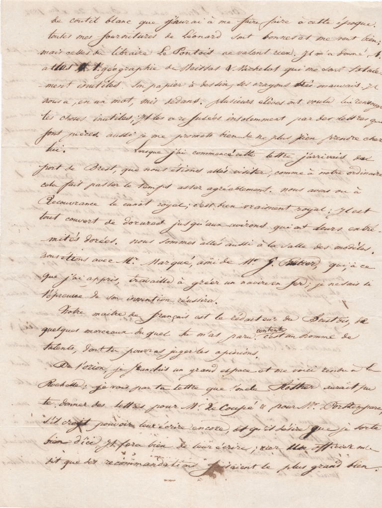 De l’Orion, je franchis un grand espace et me voici rendu à La Rochelle : je vois par ta lettre que l’oncle Rother aurait pu te donner des lettres pour M. Le Coupé & pour M. Portramparc : s’il croit pouvoir leur écrire encore, et qu’il désire que je sorte bien d’ici, il fera bien de leur écrire ; car un officier m’a dit que des recommandations faisaient le plus grand bien. Je travaille parce que je suis persuadé que de bonnes notes sont ce qu’il y a de meilleur, mais les protections ne font jamais le moindre mal. Voilà 2 dimanches de suite que le commandant passe muet devant moi. Cette semaine encore je n’ai point été interrogé, mais dans les deux jours suivants, je le serai peut être. Jusqu’à présent je n’ai pas eu la plus légère punition et il parait que cela influe beaucoup sur les examens. Mais il y en a beaucoup comme moi.