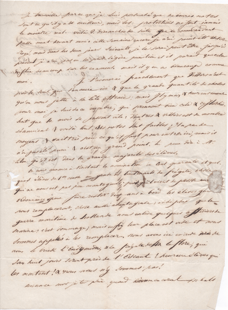 On nous annonce à l’instant la nomination de cent quarante et quelques élèves de 1° classe au grade de lieutenants de frégate, chose qui ne nous est pas peu avantageux ; puis, qu’il vient de passer une ordonnance pour faire rester deux ans à bord les élèves qui nous remplaceront, chose aussi avantageuse ; et de plus que la guerre maritime de hollande nous enlève quelques officiers de marine : c’est dommage, mais enfin leur place est vide et nous sommes appelés à les remplacer. Nous avons ici en rade près de nous le brick l’Endymion, & la frégate de 40 la Flore, qui sous huit jours seront près de l’Escaut ! Heureux élèves qui les montent ! & nous nous n’y sommes pas |