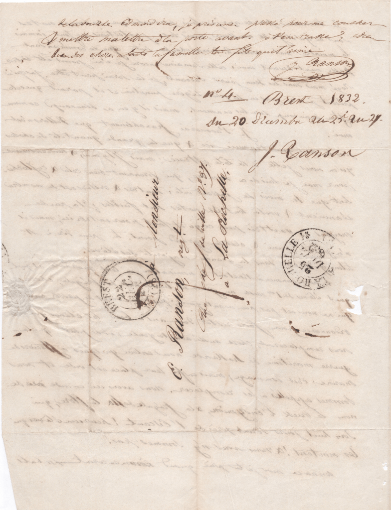 Lettre du 20 décembre 1832 de Jean Ranson à Monsieur E. Ranson neg’ rue chef de ville n°37 à La Rochelle