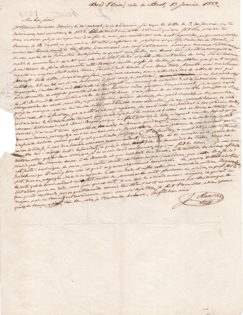 Je t’écrivis dimanche dernier, 6 ou courant, et le lendemain j’ai reçu ta lettre du 3 de janvier que tu dates encore, mais par erreur, de 1832. Elle contenait une lettre d’Edmond qui m’a fait bien plaisir. Tu peux l’assurer que je lui répondrais à la fin du mois, car maintenant cela m’est impossible, vu que nous passons l’examen le 23, d’après ce que nous a dit notre professeur de physique : et qu’il faut redoubler de travail. Je ne sais pas trop si comme tu t’en flattes, je conserverai mon rang à cet examen, parce que beaucoup d’élèves avaient vu la géométrie descriptive, ce qui est mon faible, car avant-hier j’ai été interrogé et ce matin le commandant m’a dit que ma note était faible et qu’il attendait mieux de moi. D’ici à l’examen je vais tacher de faire disparaître cette tache et j’espère que, si je baisse, je ne perdrai que 5 ou 6 rangs. Ma note en anglais était assez bonne. J’ai écrit jeudi dernier à ma bonne tante Mariette, mais maintenant je remets toute lettre jusqu’à ce que j’aie passé mon examen. Vous n’attendrez donc de lettre de moi que datée du 25 au 30 car je ne sais encore à quel rang je passerai. Je ne suis point chef de gamelle, l’autorité a mis obstacle à nos projets en nommant les numéros 3 et 4 d’admission. Tu peux ainsi connaître les chefs de gamelle, ils sont bons, meilleurs même que ceux d’auparavant. J’ai rempli auprès de M. Dubreuil ta commission et celle de Mme Rang. Il m’a promis de les transmettre à son épouse et m’a chargé de bien des choses pour toi, ce qu’il n’oublie jamais toutes les fois qu’il me parle et tu pense bien que je ne manque pas de lui rendre de ta part toutes choses aimables.
