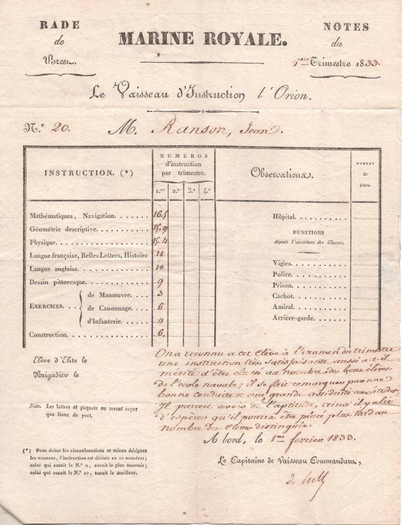 On a reconnu à cet élève à l’examen du trimestre une instruction très satisfaisante aussi a-t-il mérité d’être classé au nombre des bons élèves de l’école navale ; il se fait remarquer par une bonne conduite et une grande assiduité aux études. Il parait avoir de l’aptitude, ainsi il y a lieu d’espérer qu’il pourra être placé plus tard au nombre des élèves distingués.