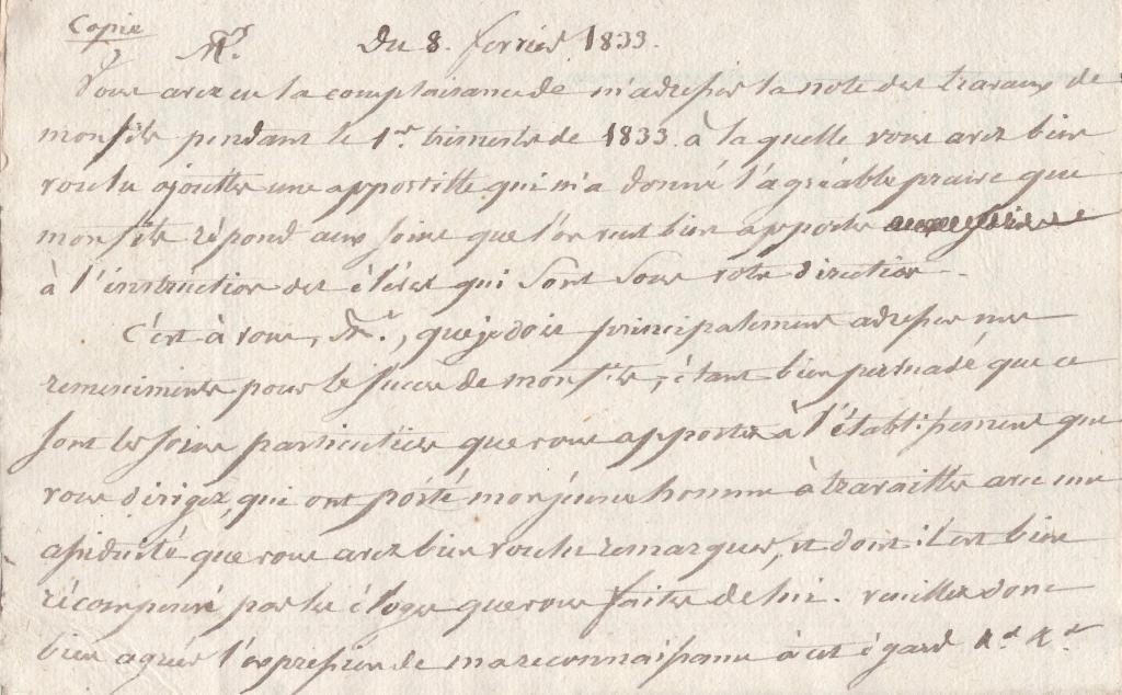 M. Vous avez eu la complaisance de m’adresser la note des travaux de mon fils pendant le 1° trimestre de 1833 à laquelle vous avez bien voulu ajouter une apostille qui m’a donné l’agréable preuve que mon fils répond aux soins que l’on veut bien apporter à l’instruction des élèves qui sont sous votre direction.