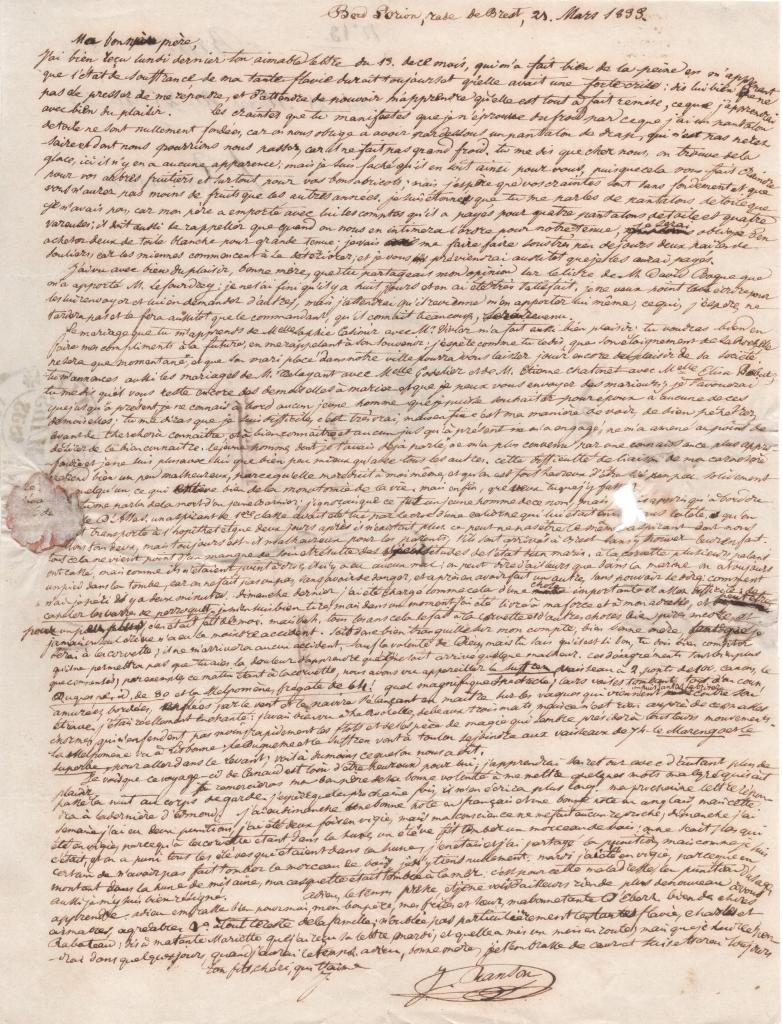 Adieu, le temps presse, et je ne vois d’ailleurs rien de plus de nouveau à vous apprendre. Adieu embrasse bien pour moi, mon bon père, mes frères et sœur, ma bonne tante D’Eberz. Bien des choses aimables, agréables & à tout le reste de la famille ; n’oublie pas particulièrement les tantes Flavie, Charles et Raboteau, dis à ma tante Mariette que j’ai reçu sa lettre mardi, et qu’elle a mis un mois en route, mais que je lui répondrai dans quelques jours, quand j’aurai le temps. Adieu, bonne mère, je t’embrasse de cœur et suis et serai toujours ton fils chéri qui t’aime.
