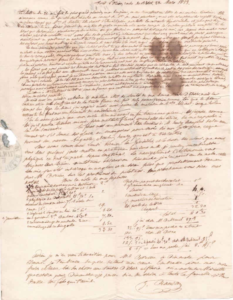 Nous avons commencé lundi dernier la géodésie, et le lever des plans, que nous irons sous quelques jours mettre en pratique. Nous irons aussi, je pense, au cabinet de physique, ce dont on parle depuis longtemps. La navigation et l’Astronomie vont toujours leurs trains. Bientôt nous observerons. Dimanche je n’ai point eu de notes. Cette semaine j’ai été interrogé en anglais et le serai plus que probablement demain par M. Borius, sur les problèmes du pilotage. Ma prochaine vous dira mes notes.