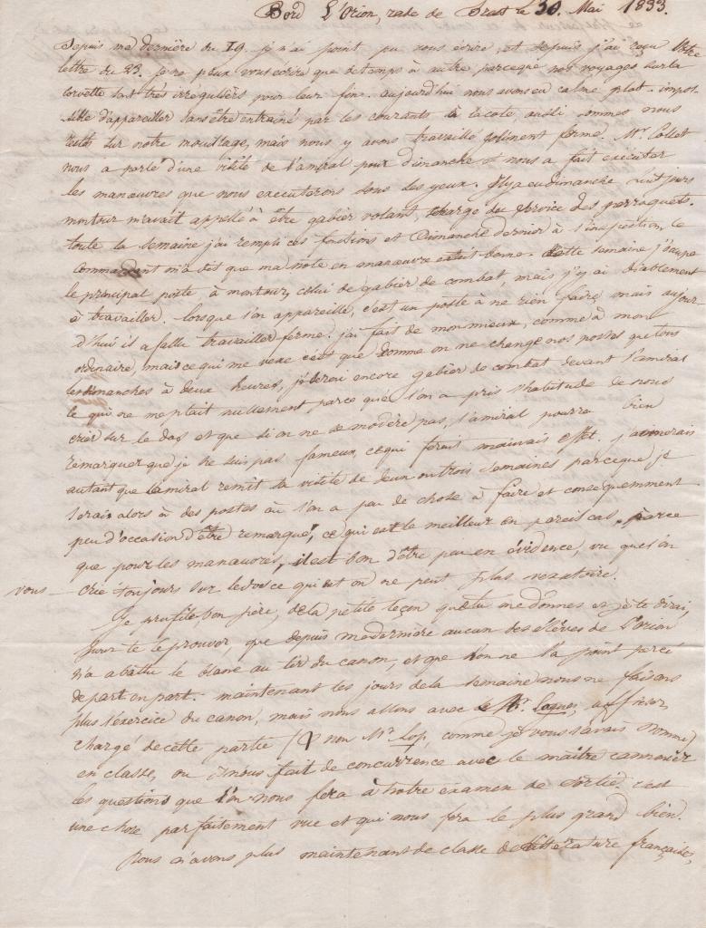 Je profite, bon père, de la petite leçon que tu me donnes et je te dirai, pour te le prouver, que depuis ma dernière aucun des élèves de l’Orion n’a abattu le blanc au tir du canon, et que l’on ne l’a point percé de part en part. Maintenant les jours de la semaine nous ne faisons plus l’exercice du canon, mais nous allons avec M. Lagnes, officier chargé de cette partie (& non M. Lop, comme je vous l’avais nommé) en classe, où il nous fait de concurrence avec le maître canonnier les questions que l’on nous fera à notre examen de sortie. C’est une chose parfaitement vue et qui nous fera le plus grand bien.