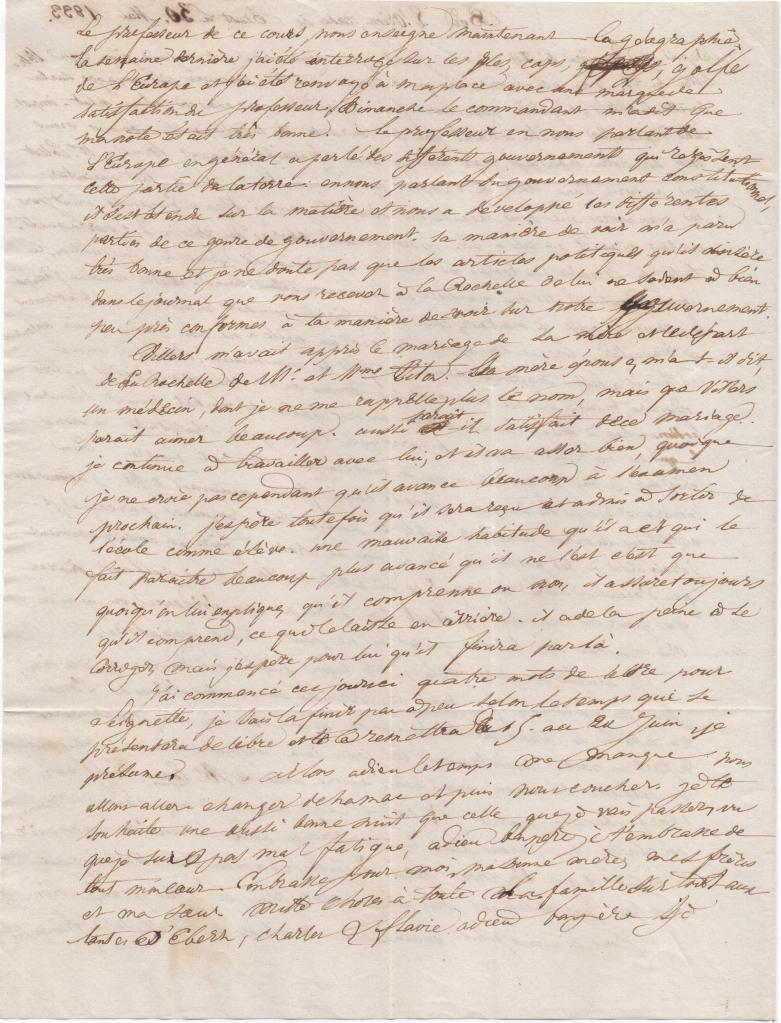 Nous n’avons plus maintenant de classe de littérature française, le professeur de ce cours, nous enseigne maintenant la géographie. La semaine dernière j’ai été interrogé sur les îles, caps, golfes de l’Europe et j’ai été renvoyé à ma place avec une marque de satisfaction du professeur. Dimanche le commandant m’a dit que ma note était très bonne. Le professeur en nous parlant de l’Europe en général a parlé des différents gouvernements qui régissent cette partie de la terre. En nous parlant du gouvernement constitutionnel, il s’est étendu sur la matière et nous a développé les différentes parties de ce genre de gouvernement. Sa manière de voir m’a paru très bonne et je ne doute pas que les articles politiques qu’il insère dans le journal que vous recevez à La Rochelle de lui ne soient à bien peu près conformes à ta manière de voir sur notre gouvernement.