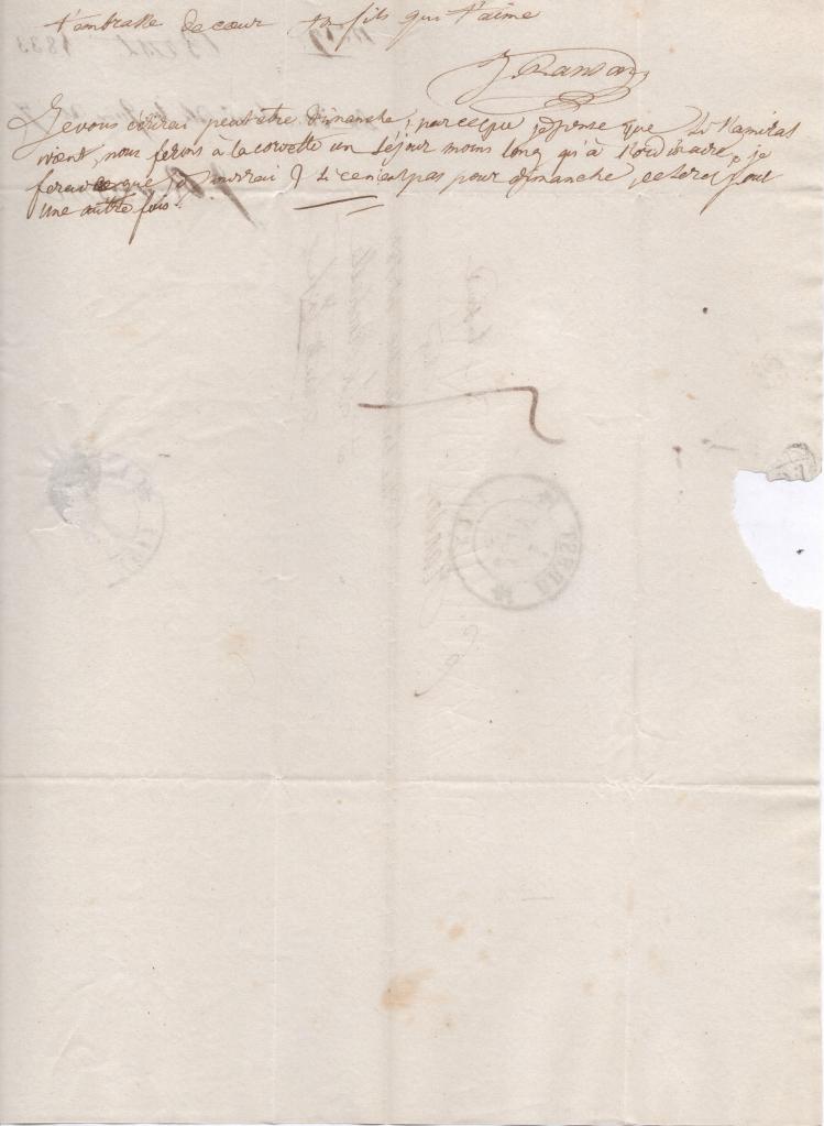 Je vous écrirai peut-être dimanche, parce que je pense que si l’amiral vient, nous ferons à la corvette un séjour moins long qu’à l’ordinaire, je ferai ce que je pourrai, & si ce n’est pas pour dimanche, ce sera pour une autre fois.