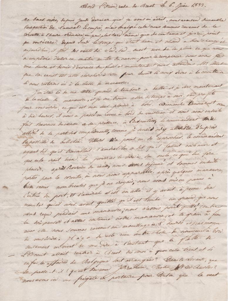 J’en étais là de ma lettre quand le tambour a battu et je sors maintenant de la classe de manœuvre, et je me trouve assez de temps à moi. J’en profite pour vous écrire, ce qui est mon seul plaisir à bord. Dimanche l’amiral est venu à dix heures, il nous a passé en revue à bord du vaisseau et nous avons ensuite fait l’exercice du canon en sa présence. A l’inspection, le commandant m’a attiré de sa part des compliments, comme je devais m’y attendre d’après l’apostille du bulletin. Villers n’a point eu de reproches, le commandant ayant dit qu’il travaillait : l’amiral lui a dit qu’il fallait continuer et que cela irait bien. Tu pourras le dire à son oncle, ce qui lui fera plaisir. Après l’exercice du canon, nous avons déjeuné et sommes ensuite partis pour la corvette, où nous avons ensuite appareillé. Après quelques manœuvres, bien moins nombreuses que je ne croyais, nous avons mis en panne à l’entrée du port, et l’amiral s’est en allé. Il y avait à peine dix minutes qu’il nous avait quittés qu’il est tombé un grain, que nous avons reçu pendant une manœuvre ; nous n’avons point quitté, combien tu dois penser et avons continué notre manœuvre, et le grain a fini avec elle. Nous sommes revenus au mouillage à 5 heures et pas moyen de vous écrire. Il n’y a du reste rien autre chose de nouveau à bord. Seulement on vient de me dire à l’instant que la flotte de l’Escaut allait rentrer à Brest. Dis-moi à quoi cela tient et si enfin les affaires de Belgique sont arrangées ? Dans le Levant, que se passe-t-il ? Qu’est devenu Ibrahim-Pacha et les Russes ? Nous avons ici une frégate en partance pour […iton?] que le vent contrarie joliment.