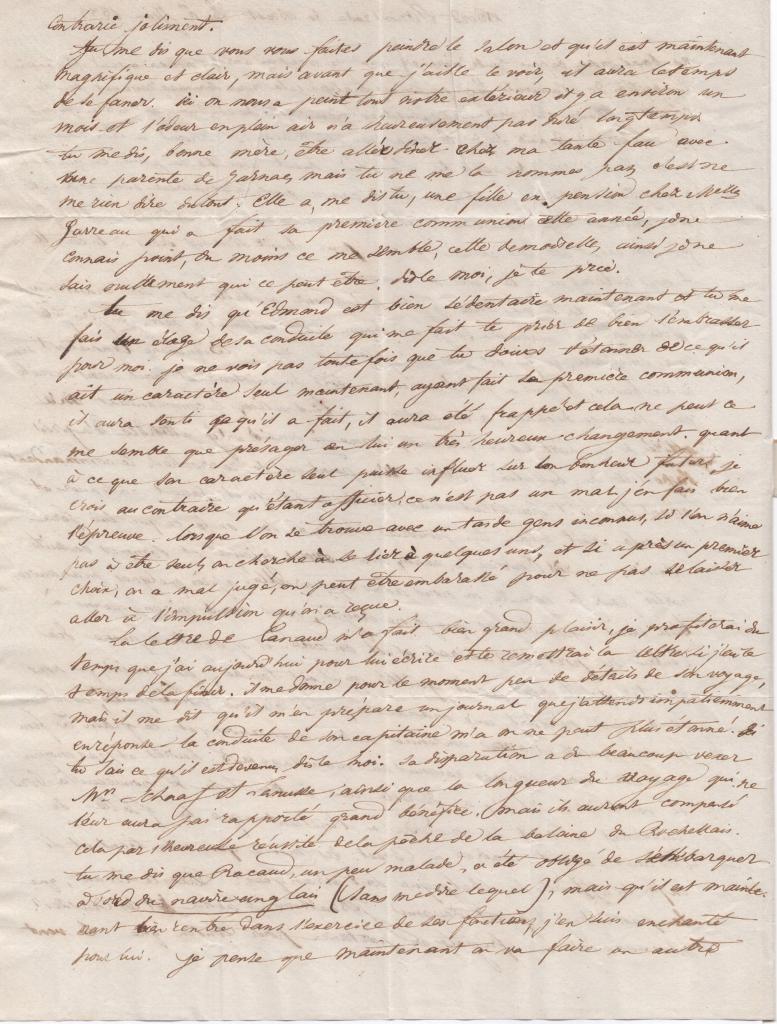 Tu me dis qu’Edmond est bien sédentaire maintenant et tu me fais un éloge de sa conduite qui me fait te prier de bien l’embrasser pour moi. Je ne vois pas toutefois que tu doives t’étonner de ce qu’il ait un caractère seul maintenant, ayant fait sa première communion, il aura senti ce qu’il a fait, il aura été frappé et cela ne peut ce me semble que présager en lui un très heureux changement. Quant à ce que son caractère seul puisse influer sur son bonheur futur, je crois au contraire qu’étant officier, ce n’est pas un mal j’en fais bien l’épreuve. Lorsque l’on se trouve avec un tas de gens inconnus, si l’on n’aime pas à être seul, on cherche à se lier à quelques-uns, et si après un premier choix, on a mal jugé, on peut être embarrassé pour ne pas se laisser aller à l’impulsion qu’on a reçue.