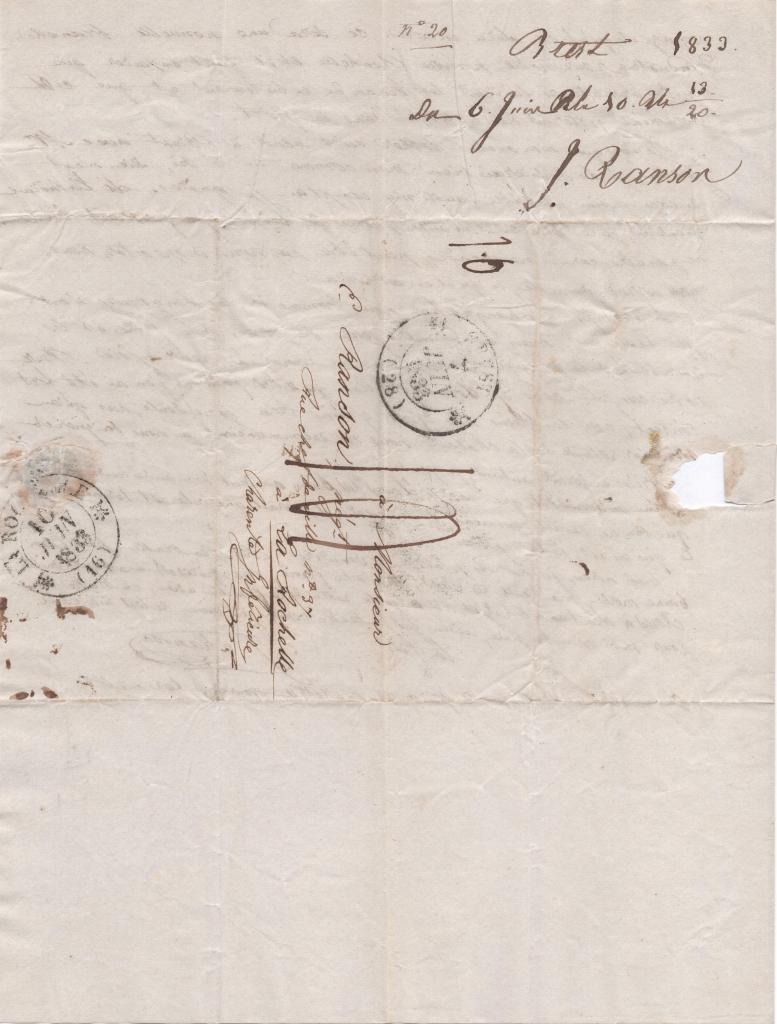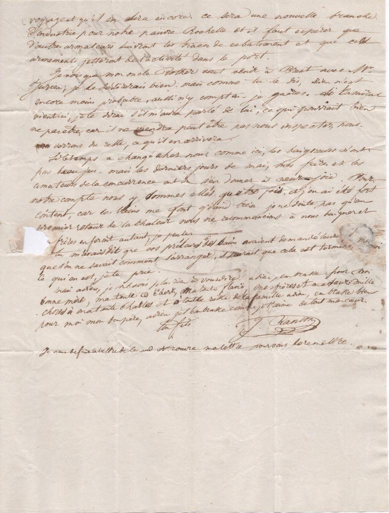 La lettre de Canaud m’a fait bien grand plaisir, je profiterai du temps que j’ai aujourd’hui pour lui écrire et te remettrai la lettre si j’ai le temps de la finir. Il me donne pour le moment peu de détails de son voyage, mais il me dit qu’il en prépare un journal que j’attends impatiemment en réponse. La conduite de son capitaine m’a on ne peut plus étonné. Si tu sais ce qu’il est devenu, dis-le moi. Sa disparition a du beaucoup vexer MM. Schaaf et Lanusse, ainsi que la longueur du voyage qui ne leur aura pas rapporté grand bénéfice. Mais ils auront compensé cela par l’heureuse réussite de la pêche de la baleine du Rochellais. Tu me dis que Racaud, un peu malade, a été obligé de s’embarquer à bord du navire anglais (sans me dire lequel), mais qu’il est maintenant bien rentré dans l’exercice de ses fonctions, j’en suis enchanté pour lui. Je pense que maintenant on va faire un autre voyage et qu’il en sera encore. Ce sera une nouvelle branche d’industrie pour notre pauvre Rochelle et il faut espérer que d’autres armateurs suivront les traces de ce bâtiment et que ces armements jetteront de l’activité dans le port.