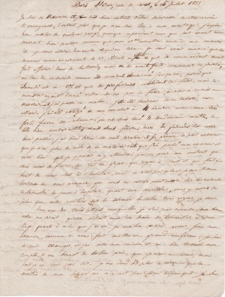 Je sors de l’examen et je suis bien content d’être débarrassé de cette corvée si ennuyeuse. D’autant plus que je m’en suis tiré à mon avantage : j’espère bien monter de quelques rangs, quoique cependant ceux qui sont avant moi pourront bien passer mieux que moi et me remettre ainsi à mon numéro 20. Je vous écrirai dimanche, ce qu’il en sera. Je vous avais annoncé que les examens commenceraient le 23, c’était en effet ce que le commandant avait fait afficher dans la batterie, mais on les avait fait commencer ce jour-là, au lieu du mercredi, comme ils avaient commencé jusqu’ici, parce que samedi est le 27 et que les professeurs voulaient le fêter, mais le ministre ayant donné ordre de ne pas le fêter, on nous a remis au mercredi et j’ai passé ce matin. J’ai été heureux de ce retard, car mardi j’ai été obligé de me coucher à 4 heures avec une très forte fièvre de rhume, je me suis levé le lendemain matin, la tête bien embarrassée, mais sans fièvre ; hier la journée s’est assez bien passée : j’ai bien dormi la nuit dernière et la preuve la plus certaine que je n’ai plus de reste de la maladie c’est que j’ai passé mon examen et aussi bien que je pouvais m’y attendre. J’ai eu peur un instant que mon accès de fièvre ne fut la grippe qui règne à Brest et qui fait que huit de nous sont à l’hôpital, mais ce n’est pas cela et je me trouve heureux de vous annoncer que vous ne verrez point encore sur les notes de ce trimestre de jours d’hôpital. Quant aux punitions, vous y verrez de plus que celles portées sur le dernier bulletin trois vigies, je crois.