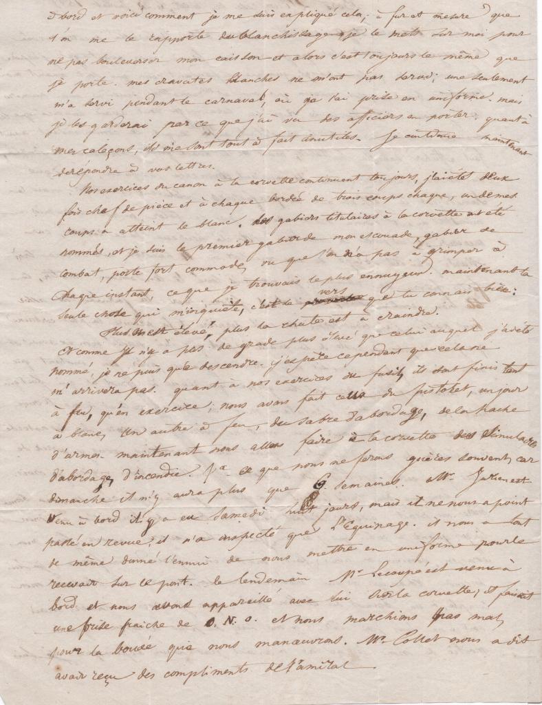 Dans une des trois lettres auxquelles je n’ai pas répondu, ma bonne mère me disait qu’elle s’était mise en train de travailler à mon linge ; quant à celui que j’ai ici, ce matin après avoir fini mon examen, comme on nous fait mettre en grand uniforme, je suis descendu changer, et j’ai vidé mon caisson, et ai bien trouvé mon compte, à un bonnet de coton près, que je crois à laver, mais dont je ne suis pas sûr. Je me suis de plus aperçu que la moitié de mon linge ne m’avait pas servi depuis que je suis à bord et voici comment je me suis expliqué cela ; à fur et à mesure que l’on me le rapporte du blanchissage, je le mets sur moi pour ne pas bouleverser mon caisson et alors c’est toujours le même que je porte. Mes cravates blanches ne m’ont pas servi ; une seulement m’a servi pendant le carnaval, où je l’ai prise en uniforme. Mais je les garderai parce que j’ai vu des officiers en porter. Quant à mes caleçons, ils me sont tout à fait inutiles. Je continue maintenant de répondre à vos lettres.