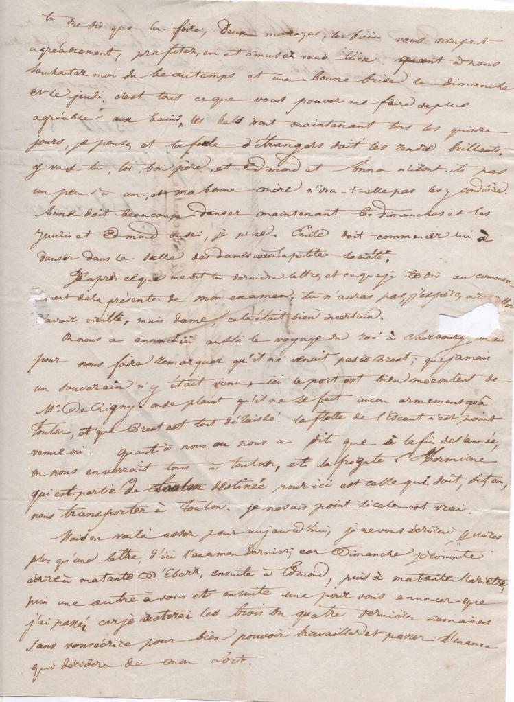 Tu me dis que la foire, deux mariages, les bains vous occupent agréablement, profitez-en et amusez- vous bien. Quant à nous souhaitez-moi du beau temps et une bonne brise le dimanche et le jeudi. C’est tous ce que vous pouvez me faire de plus agréable. Aux bains, les bals sont maintenant tous les quinze jours, je pense, et la foule d’étrangers doit les rendre brillants. Y vas-tu, toi, bon père, et Edmond et Anna n’iront-ils pas un peu à un, et ma bonne mère n’ira-t-elle pas les y conduire. Anna doit beaucoup danser maintenant les dimanches et les jeudis et Edmond aussi, je pense. Emile doit commencer lui à danser dans la salle des dames avec la petite société.