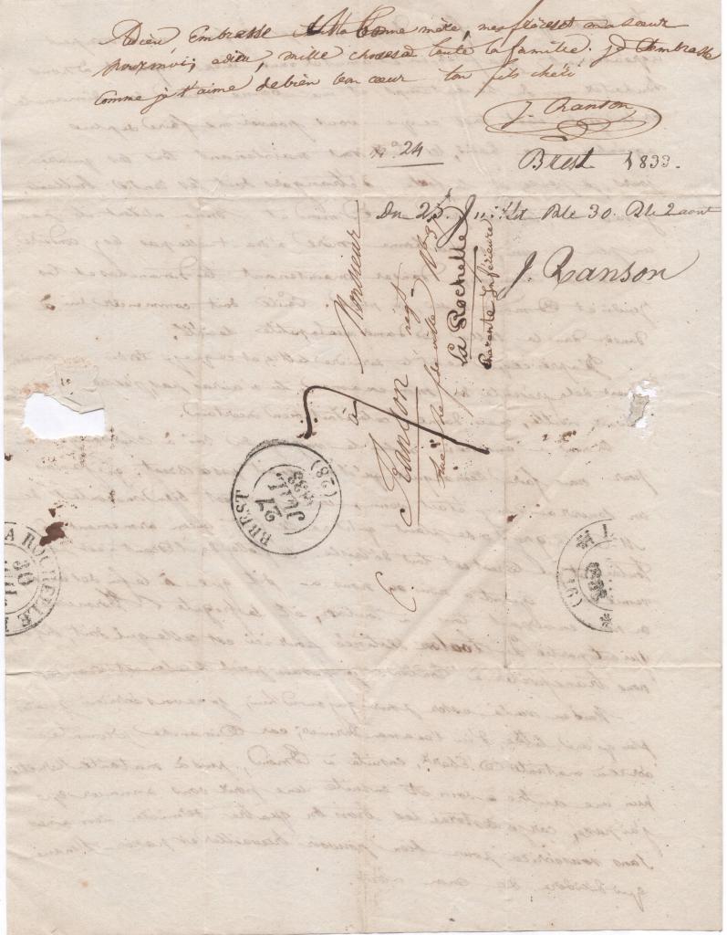 On nous a annoncé ici aussi le voyage du roi à Cherbourg, mais pour nous faire remarquer qu’il ne venait pas à Brest ; que jamais un souverain n’y était venu. Ici le port est bien mécontent de M. De Rigny. On se plaint qu’il ne se fait aucun armement qu’à Toulon, et que Brest est bien délaissé. La flotte de l’Escaut n’est point venue ici. Quant à nous on nous a dit que à la fin de l’année, on nous enverrait tous à Toulon, et la frégate l’’Hermione qui est partie de Toulon destinée pour ici est celle qui doit, dit-on, nous transporter à Toulon. Je ne sais point si cela est vrai.