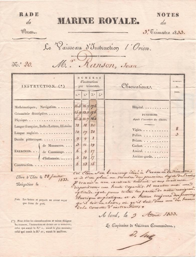 Cet Elève s’est beaucoup élevé à l’examen du trimestre et il s’est placé au nombre des premiers sujets de l’école. Il réunit à une excellente conduite et aux meilleures dispositions une haute capacité. I| montre ainsi une aptitude égale pour toutes les parties de notre enseignement théorique et pratique et se trouve toujours des premiers, qu’il soit en classe, ou qu’il soit dans une des hunes de la corvette d’instruction.