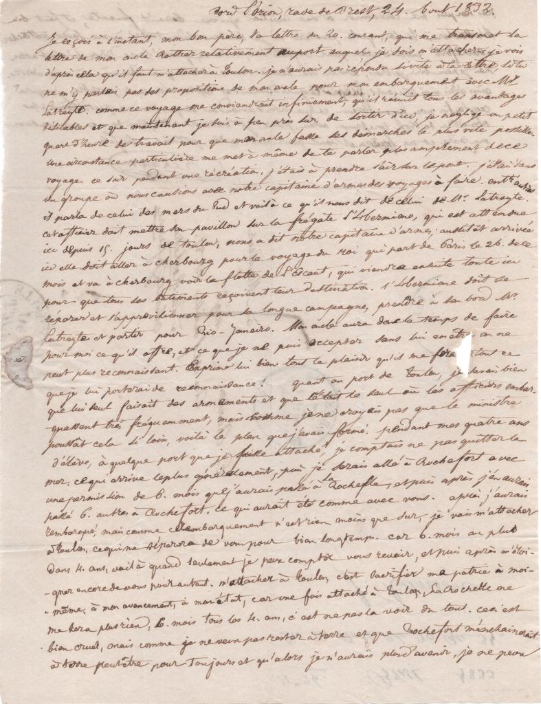 Je reçois à l’instant, mon bon père, ta lettre du 20 courant, qui me transmet la lettre de mon oncle Rother relativement au port auquel je dois m’attacher, je vois d’après cela qu’il faut m’attacher à Toulon. Je n’aurais pas répondu si vite à ta lettre, si tu ne m’y parlais pas des propositions de mon oncle pour mon embarquement avec M. Latreyte. Comme ce voyage me conviendrait infiniment, qu’il réunit tous les avantages désirables et que maintenant je suis à peu près sur de sortir d’ici, je néglige un petit quart d’heure de travail pour que mon oncle fasse les démarches le plus vite possible. Une circonstance particulière me met à même de te parler plus amplement de ce voyage ce soir pendant une récréation. J’étais à prendre l’air sur le pont. J’étais dans un groupe où nous causions avec notre capitaine d’armes des voyages à faire. Entre autres il parla de celui des mers du Sud et voilà ce qu’il nous dit de celui de M. Latreyte : Cet officier doit mettre son pavillon sur la frégate l’Hermione, qui est attendue ici depuis 15 jours de Toulon, nous a dit notre capitaine d’armes ; aussitôt arrivé ici elle doit aller à Cherbourg pour le voyage du roi qui part de Paris le 26 de ce mois et va à Cherbourg voir la flotte de l’Escaut, qui viendra ensuite toute ici pour que tous les bâtiments reçoivent leur destination. l’Hermione doit se réparer et s’approvisionner pour sa longue campagne, prendre à son bord M. Latreyte et partir pour Rio de Janeiro. Mon oncle aura donc le temps de faire pour moi ce qu’il offre, et ce que je ne puis accepter sans lui en être on ne peut plus reconnaissant. Exprime-lui bien tout le plaisir qu’il me fera [et] tout ce que je lui porterai de reconnaissance !