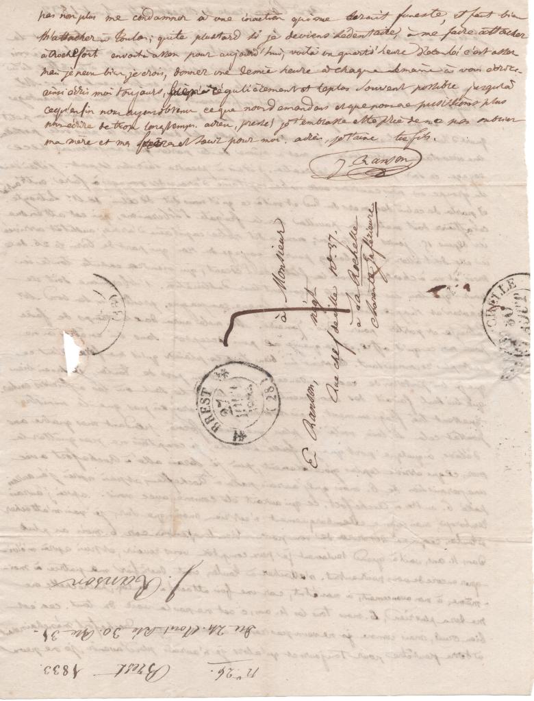 Quant au port de Toulon, je savais bien que lui seul faisait des armements et que c’était le seul où les officiers embarquassent très fréquemment, mais comme je ne croyais pas que le ministre poussât cela si loin, voilà le plan que j’avais formé. Pendant mes quatre ans d’élève, à quelque port que je fusse attaché, je comptais ne pas quitter la mer, ce qui arrive le plus généralement, puis je serai allé à Rochefort avec une permission de 6 mois que j’aurais passé à La Rochelle, et puis après j’en aurais passé 6 autres à Rochefort. Ce qui aurait été comme avec vous. Après j’aurai rembarqué, mais comme ce rembarquement n’est rien moins que dur, je vais m’attacher à Toulon. Ce qui me séparera de vous pour bien longtemps. Car 6 mois au plus dans 4 ans, voilà quand seulement je peux compter vous revoir, et puis après m’éloigner encore de vous pour autant. M’attacher à Toulon, c’est sacrifier ma patrie à moi-même, à mon avancement, à mon État, car une fois attaché à Toulon, La Rochelle ne me sera plus rien, 6 mois tous les 4 ans, c’est ne pas la voir du tout. Ceci est bien cruel, mais comme je ne veux pas rester à terre et que Rochefort m’enchaînerait à terre peut-être pour toujours et qu’alors je n’aurais plus d’avenir, je ne peux pas non plus me condamner à une inaction qui me serait funeste, il faut bien m’attacher à Toulon ; quitte plus tard si je deviens sédentaire, à me faire attacher à Rochefort. En voilà assez pour aujourd’hui, voilà un quart d’heure d’écoulé c’est assez, mais je peux bien, je crois, donner une demi-heure à chaque semaine à vous écrire. Ainsi écris-moi toujours, bien régulièrement et le plus souvent possible jusqu’à ce qu’enfin nous ayons obtenu ce que nous demandons et que nous ne puissions plus nous écrire de trop longtemps. Adieu, pressé, je t’embrasse et te prie de ne pas oublier ma mère et mes frères et sœur pour moi. Adieu, je t’aime ton fils.