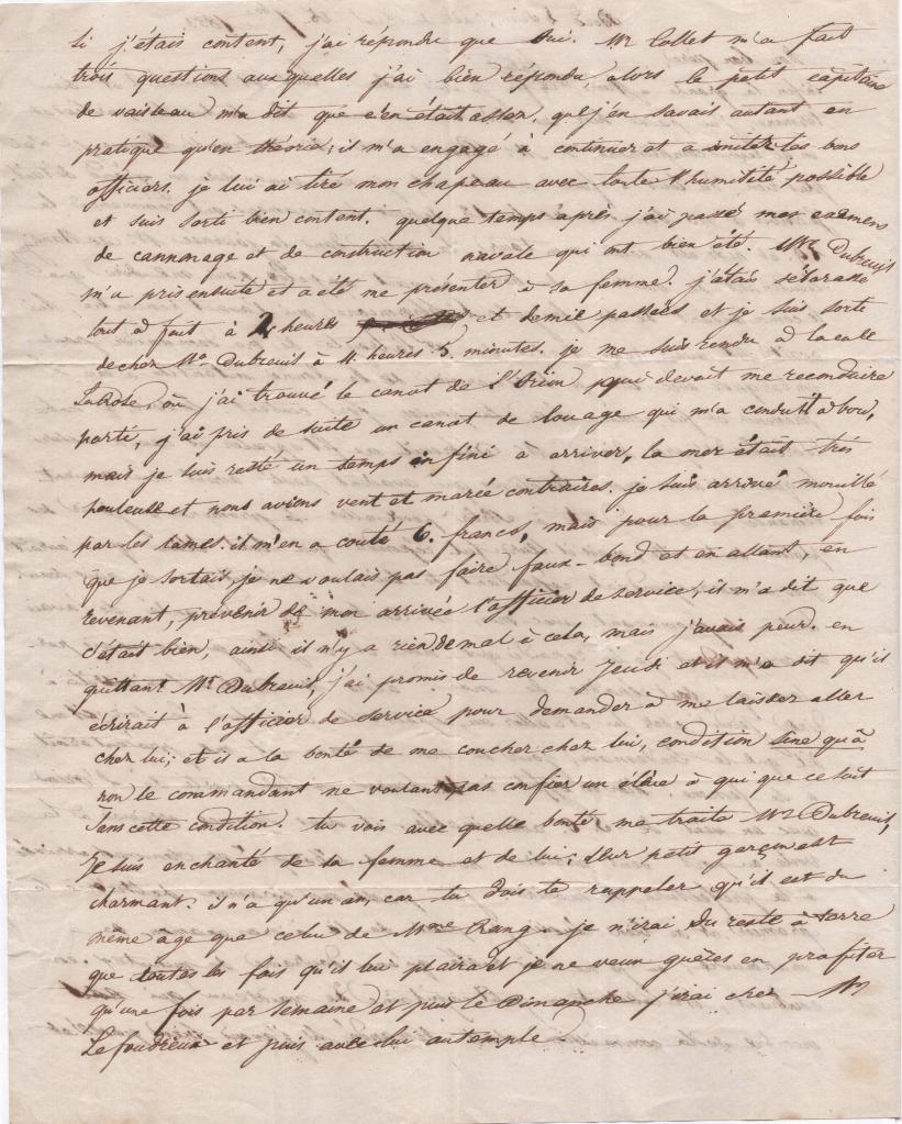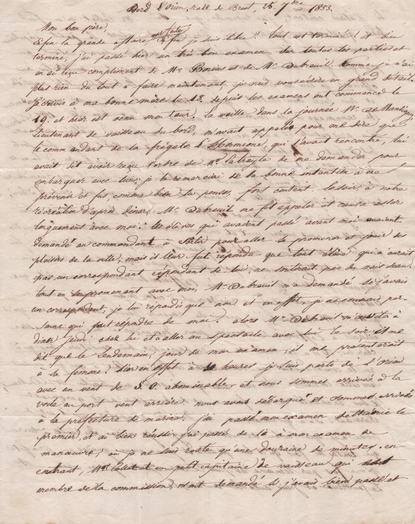 Enfin la grande affaire est faite, enfin je suis libre ! Tout est terminé ! Et bien terminé, j’ai passé hier un très bon examen sur toutes les parties et en ai reçu compliment de M. Borius et de M. Dubreuil. Comme je n’ai plus rien du tout à faire maintenant, je vais vous écrire en grand détail. J’écrivis à ma bonne mère le 18, depuis les examens ont commencé le 19 et hier est venu mon tour. La veille dans la journée M. De Mansigny, Lieutenant de Vaisseau du bord, m’avait appelé pour me dire que le commandant de la frégate l’Hermione, qui l’avait rencontré, lui avait dit avoir reçu l’ordre de M. Latreyte de me demander pour embarquer avec lui ; je le remerciais de sa bonne intention à me prévenir et fus, comme bien tu penses, fort content. Le soir, à notre récréation d’après dîner, M. Dubreuil me fit appeler et causa assez longuement avec moi. Les élèves qui avaient passé avant moi avaient demandé au commandant à sortir pour aller se promener et jouir des plaisirs de la ville; mais il leur fut répondu que tout élève qui n’aurait pas un correspondant répondant de lui, ne sortirait pas du vaisseau. Tout en se promenant avec moi, M. Dubreuil m’a demandé si j’avais un correspondant, je lui répondis que non. Et en effet je ne connais personne qui put répondre de moi. Alors M. Dubreuil m’invita à dîner jeudi chez lui et à aller au spectacle avec lui le soir : il me dit que le lendemain, jour de mon examen, il me présenterait à sa femme. Hier en effet à 10 heures je suis parti de l’Orion avec un vent de S.O. abominable, et nous sommes arrivés à la voile au port vent arrière. Nous avons débarqué et sommes arrivés à la préfecture de marine. J’ai passé mon examen de théorie le premier, et ai bien réussi. J’ai passé de là mon examen de manœuvre, où je ne suis resté qu’une douzaine de minutes. En entrant, M. Collet et un petit capitaine de vaisseau qui est membre de la commission, m’ont demandé si j’avais bien passé et si j’étais content, j’ai répondu que oui. M. Collet m’a fait trois questions auxquelles j’ai bien répondu, alors le capitaine de vaisseau m’a dit que c’en était assez, que j’en savais autant en pratique qu’en théorie ; il m’a engagé à continuer et à imiter les bons officiers. Je lui ai tiré mon chapeau avec toute l’humilité possible et suis sorti bien content. Quelque temps après j’ai passé mes examens de canonnage et de construction navale qui ont bien été. M. Dubreuil m’a pris ensuite et a été me présenter à sa femme. J’étais débarrassé tout à fait à 4 heures et demie passée et je suis sorti de chez M. Dubreuil à 11 heures 5 minutes. Je me suis rendu à la cale La Rose, où j’ai trouvé le canot de l’Orion qui devait me reconduire parti, j’ai pris de suite un canot de louage qui m’a conduit à bord, mais je suis resté un temps infini à arriver, la mer était très houleuse et nous avions vent et marée contraires. Je suis arrivé mouillé par les lames. Il m’en a coûté 6 francs, mais pour la première fois que je sortais, je ne voulais pas faire faux-bond et en allant, en revenant, prévenir de mon arrivée l’officier de service, il m’a dit que c’était bien, ainsi il n’y a rien de mal à cela, mais j’avais peur. En quittant M. Dubreuil, j’ai promis de revenir jeudi et il m’a dit qu’il écrirait à l’officier de service pour demander à me laisser aller chez lui ; et il a la bonté de me coucher chez lui, condition sine qua non le commandant ne voulant pas confier un élève à qui que ce soit sans cette condition. Tu vois avec quelle bonté me traite M. Dubreuil, je suis enchanté de sa femme et de lui; leur petit garçon est charmant. Il n’a qu’un an, car tu dois te rappeler qu’il est du même âge que celui de Mme Rang. Je n’irai du reste à terre que toutes les fois qu’il lui plaira et je ne veux guère en profiter qu’une fois par semaine et puis le dimanche j’irai chez M. Lefourdrey et puis avec lui au temple.