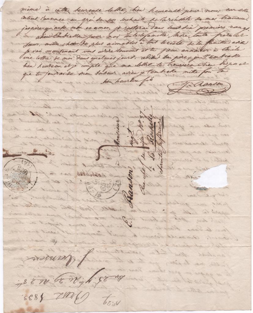Adieu. Embrasse pour moi toute la famille, mère, tantes, frères et sœur. Mille choses des plus aimables à tout le reste de la famille. Adieu. Je vais maintenant vous écrire souvent et tu peux annoncer à Emile une lettre de moi dans quelques jours. Adieu bon père, je t’embrasse bien heureux et je compte que ma lettre te trouvera bien dispos et que tu jouiras de mon bonheur. Adieu je t’embrasse mille fois ton bienheureux fils