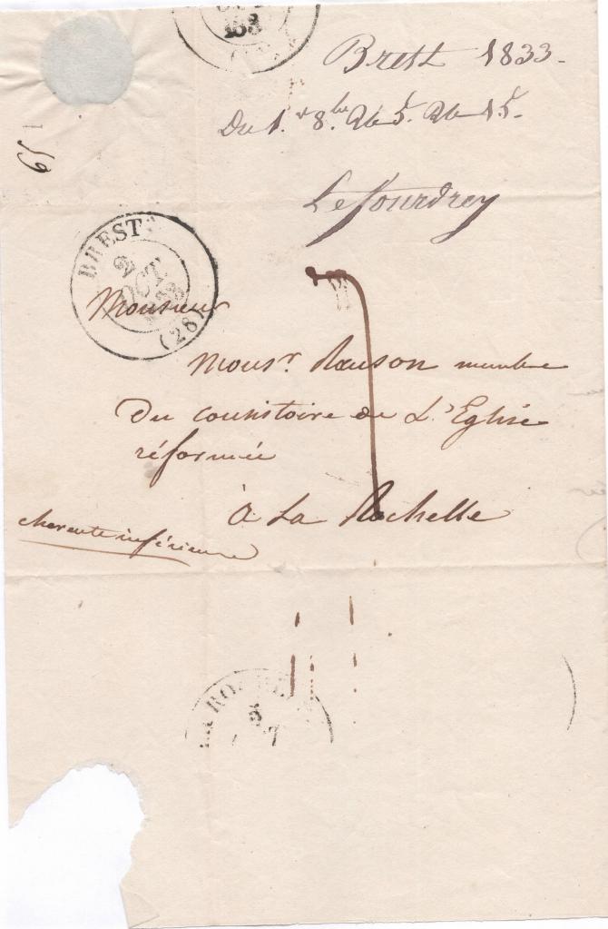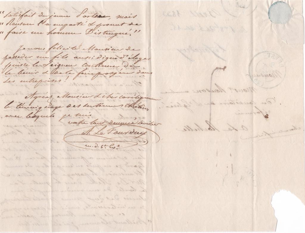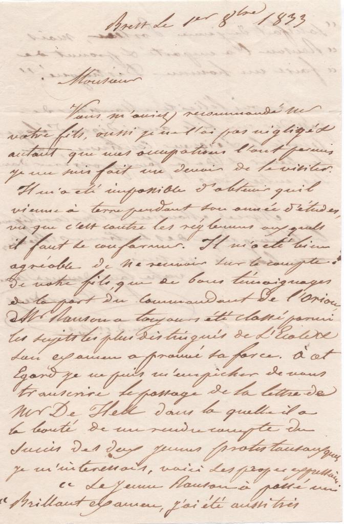 Il m’a été impossible d’obtenir qu’il vienne à terre pendant son année d’études, vu que c’est contre les règlements auxquels il faut se conformer. Il m’a été bien agréable de ne recevoir sur le compte de votre fils, que de bons témoignages de la part du commandant de l’Orion, M. Ranson a toujours été classé parmi les sujets les plus distingués de l’école & son examen a prouvé sa force. A cet égard je ne puis m’empêcher de vous transcrire le passage de la lettre de M. De Hell dans laquelle il a la bonté de me rendre compte du succès des deux jeunes protestants auxquels je m’intéressais, voici ses propres expressions :