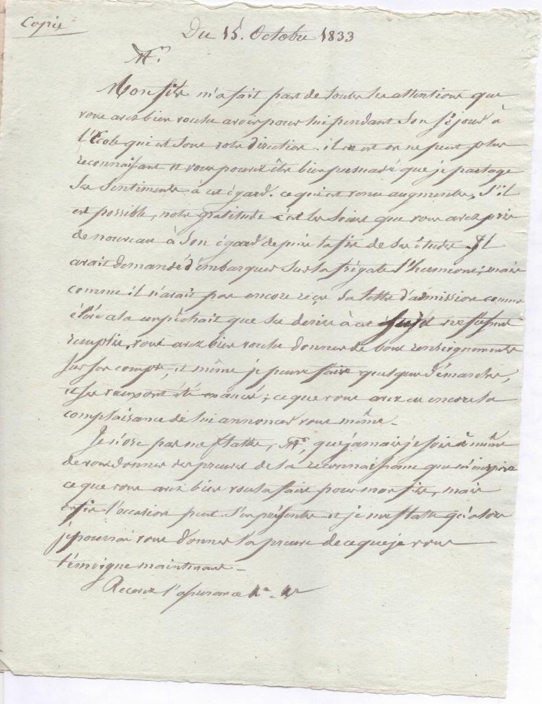 Mon fils m’a fait part de toutes les attentions que vous avez bien voulu avoir pour lui pendant son séjour à l’Ecole qui est sous votre direction. Il en est on ne peut plus reconnaissant et vous pouvez être bien persuadé que je partage ses sentiments à cet égard. Ce qui est venu augmenter, s’il est possible, notre gratitude, c’est les soins que vous avez pris de nouveau à son égard depuis la fin de ses études. Il avait demandé d’embarquer sur la frégate l’Hermione; mais comme il n’avait pas encore reçu sa lettre d’admission comme élève cela empêchait que ses désirs à ce sujet ne fussent remplis. Vous avez bien voulu donner de bons renseignements sur son compte, et même je pense faire quelques démarches, et ses vœux ont été exaucés ; ce que vous avez eu encore la complaisance de lui annoncer vous-même.
