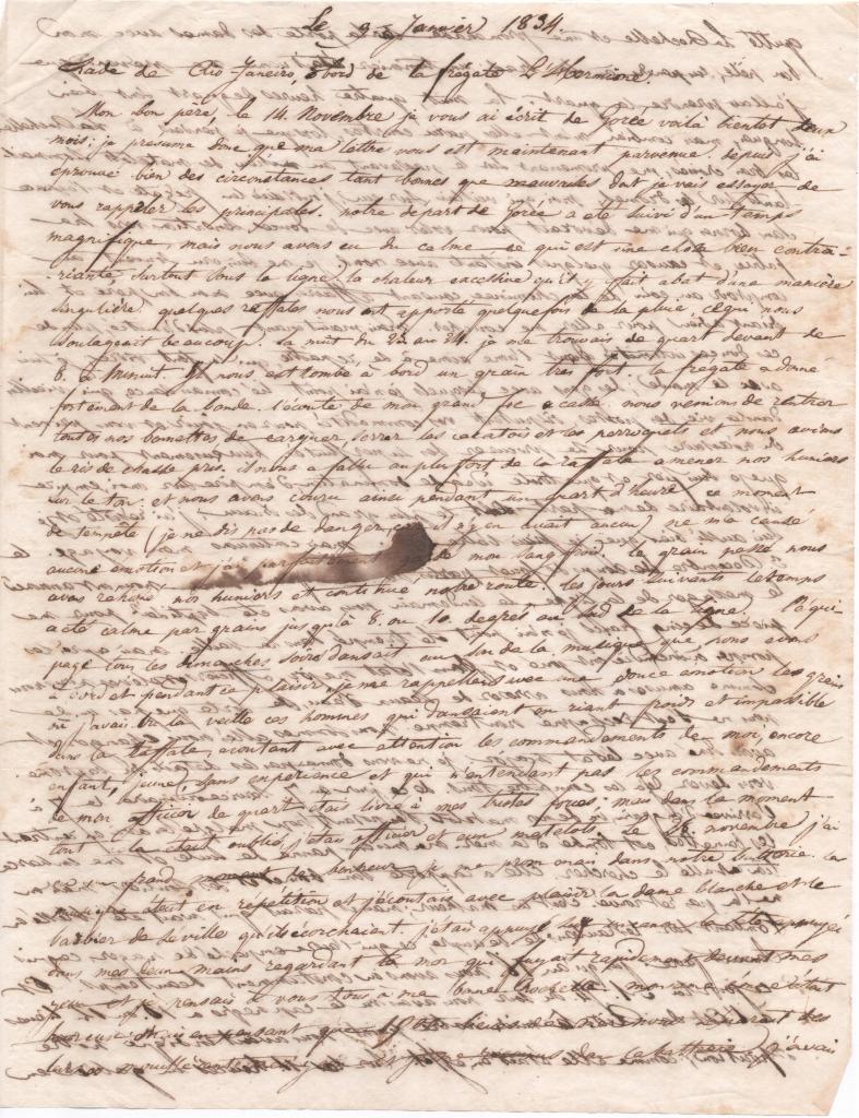Mon bon père, le 14 novembre je vous ai écrit de Gorée voilà bientôt deux mois ; je présume donc que ma lettre vous est maintenant parvenue. Depuis j’ai éprouvé bien des circonstances tant bonnes que mauvaises dont je vais essayer de vous rappeler les principales. Notre départ de Gorée a été suivie d’un temps magnifique, mais nous avons eu du calme, ce qui est une chose bien contrariante, surtout sous la ligne. La chaleur excessive qu’il y fait abat d’une manière singulière. Quelques rafales nous ont apporté quelquefois de la pluie, ce qui nous soulageait beaucoup. La nuit du 23 au 24 je me trouvais de quart devant de 8 à minuit. Il nous est tombé à bord un grain très fort. La frégate a donné fortement de la bande. L’écoute de mon grand foc a cassé. Nous venions de rentrer toutes nos bonnettes, de carguer, serrer les cacatois et les perroquets et nous avions le ris de chasse pris. Il nous a fallu au plus fort de la rafale amener nos huniers sur le ton, et nous avons couru ainsi pendant un quart d’heure. Ce moment de tempête ( je ne dis pas de danger, car il n’y en avait aucun) ne m’a causé aucune émotion et j’ai parfaitement gardé mon sang froid. Le grain passé nous avons rehissé nos huniers et continué notre route. Les jours suivants le temps a été calme par grains jusqu’à 8 ou 10 degrés au sud de la ligne. L’équipage tous les dimanches soirs dansait au son de la musique que nous avons à bord et pendant ce plaisir, je me rappelais avec une douce émotion les grains où j’avais vu la veille ces hommes qui dansaient en riant, froids et impassible dans la rafale, écoutant avec attention les commandements de moi, encore enfant, jeune, sans expérience et qui n’entendant pas les commandements de mon officier de quart étais livré à mes tristes forces ; mais dans le moment tout cela était oublié, j’étais officier et eux matelots.