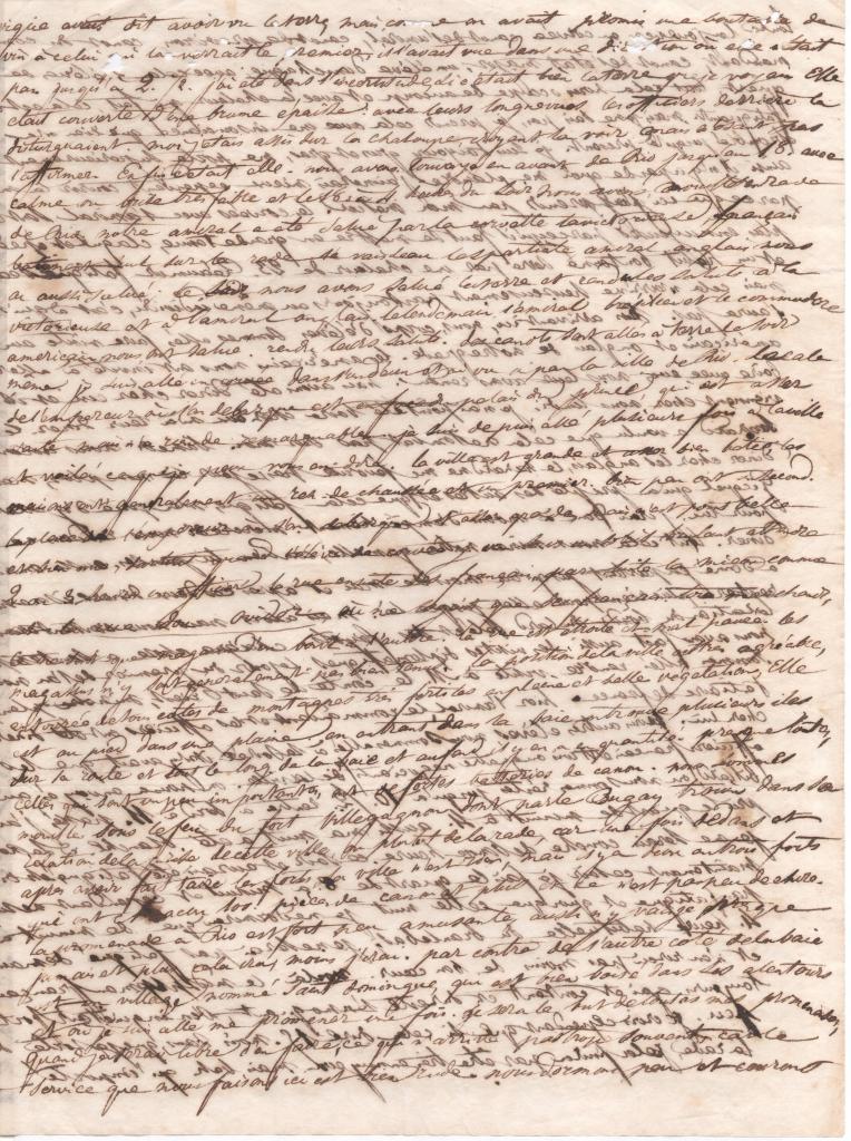 Mais voilà […] des pages de moi. De vous maintenant. Voilà 15 mois que je ne vous ai embrassé et le double encore de ce temps là se passera peut-être avant que je puisse avoir ce bonheur. Tant que j’ai été à bord de l’Orion, cela a été on ne peut mieux ; une lettre par semaine de vous me ramenait parmi vous pour quelques temps ; maintenant voilà trois mois que je n’ai eu la plus petite de vos nouvelles ; pas même un mot, le plus léger, qui m’ait rappelé ma bonne Rochelle, mes bons parents, mes bons amis ; mais j’espère que cela viendra bientôt et que le premier navire français qui arrivera ici m’apportera de vos nouvelles. Je te prie, bon père, qu’aucun bâtiment venant de France ne vienne ici sans lettre, si tu le peux ; il vient surtout ici des navires chargés de vin, de savon, de Marseille, de cette : ton correspondant M. Guien à Marseille pourra se charger, je n’en doute pas, de ces lettres. Des navires du Havre viennent aussi assez souvent. De Bordeaux et de Nantes jusqu’à présent aucun n’a paru. Je crois que le navire qui portera cette lettre va au Havre. Je m’en assurerai avant de la remettre et alors je l’adresserai à M. Hay Wilckens et Cie qui te la feront passer plus promptement que ne le ferait le capitaine, qui d’ailleurs les connaît peut-être, au moins de nom, et à cette considération là s’empresserait plus de la leur remettre que de la jeter à la poste. Dans chaque lettre donne moi tous les détails possibles, même ceux qui te paraîtrait les plus futiles et qui n’en sont pas moins intéressants. Tu vois que je n’épargne pas votre attention et ne crains pas de lasser votre bonne volonté. Veuillez donc répondre aussi longuement que je vous écris et certes vous avez plus à me dire que je n’ai moi de choses à vous raconter.