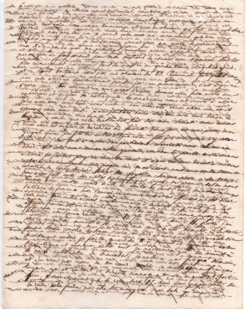En arrivant ici, nous, corps d’élèves, sommes allés faire visite aux américains et anglais de notre grade. Les américains nous ont invités à aller boire avec eux ; nous leur avons rendu. Nous avons été dîner chez eux et ils viennent chez nous lundi. Je n’ai point été boire chez eux ni à leur dîner. Le hasard a voulu que cela ne tombât pas sur moi. Samedi nous allons dîner chez les anglais, le hasard ne me favorise pas ce jour-là non plus, mais Gicquel qui a profité des autres et que cela fatigue, m’a prié d’y aller pour lui. J’irai donc à moins d’empêchement. Mercredi nous rendons ce dîner. Tout cela nous mine notre gamelle, combien tu penses. Aussi on nous a donné en partant jusqu’au mois de mai et après ces deux dîners il ne nous restera plus rien pour aller jusque là. Mais alors nous nous contenterons de la ration du bord : du lard salé et des fayots. Chaque chose a son temps. Nous avons fait aussi des visites diplomatiques. Le jour du premier de l’an nous sommes allés rendre visite à M. le comte de Saint-Priest, ministre plénipotentiaire de France. Hier l’amiral, le commandant et les officiers ont été dîner chez lui. Nous autres élèves nous sommes allés à sa soirée. Il n’y avait que les officiers français et trois ou quatre négociants de la ville. On nous a envoyés au billard, où nous sommes restés jusqu’à 10 1/2. Rentré à bord à 11 passé, j’ai pris le quart de minuit à 4 aussi ma nuit a été blanche. A La Rochelle je me serais couché de bonne heure ce soir et aurai été fatigué. Eh bien maintenant ce soir je fais le quart de 8 à minuit et cependant ne suis pas fatigué et quoique cette je ne dormirai que de minuit à 4, heure habituelle du branle-bas, je ne serai pas fatigué demain, et n’en rirai pas moins de bon cœur. Voilà le [….] français. Toujours gai et content et du reste s’en moquant, s’en inquiétant fort peu. Je crois cependant que si cela dure 15 mois sans que je sorte de la rade, cela finira par être très ennuyeux. Mais bah qu’importe !