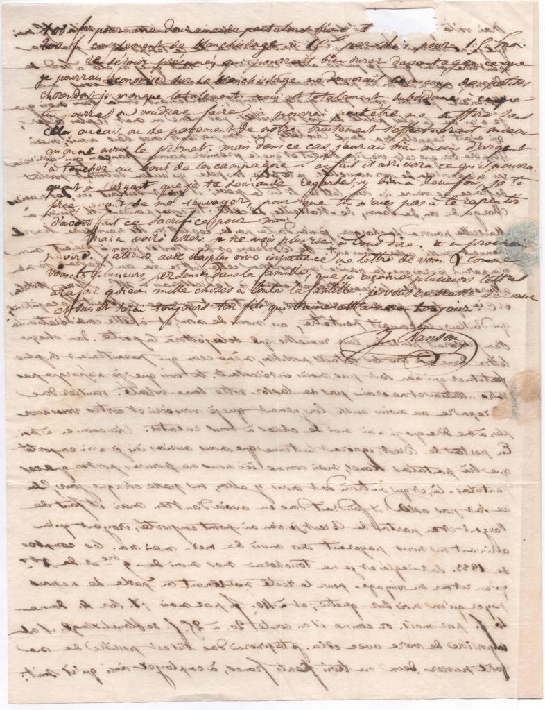 Mais en voilà assez. Je ne vois plus rien à vous dire. A un prochain navire. J’attends avec la plus vive impatience une lettre de vous. & comme vous êtes plusieurs personnes dans la famille, que je reçoive plusieurs lettres à la fois. Adieu, mille choses à toute la famille. Je vous embrasse de cœur et suis et serai toujours ton fils qui t’aime et t’aimera toujours.